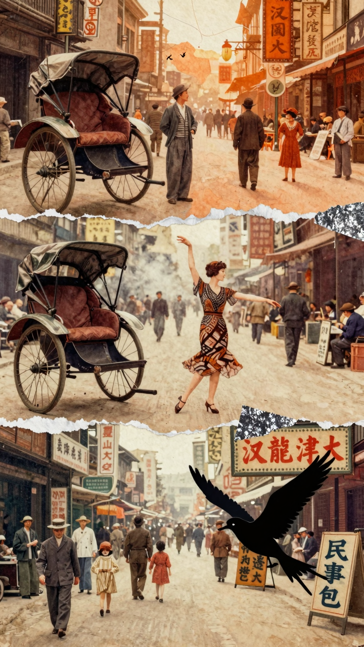 混合媒介拼贴艺术(扩写版) 提示词: “混合媒介拼贴作品,以1920年代繁华街市为主题:底层铺陈泛黄破损的老照片——人力车、报童与街头艺人;中层叠加透明水彩晕染的暖橙与赭石色块,表现阳光与蒸汽的氤氲;前景嵌入数字绘制的夸张漫画式招牌与飞鸟剪影;细节处有撕纸纹理、布料纤维扫描与金属箔闪光点缀;人物姿态生动交错,有舞者、商贩与围观孩童,形成时空错位的超现实对话,整体触觉丰富、层次鲜明,兼具怀旧温度与当代视觉实验性。” 测试点:多材质融合与层次构建、跨时代元素混搭、纹理与质感多样性、创意叙事与视觉冲击力。 |