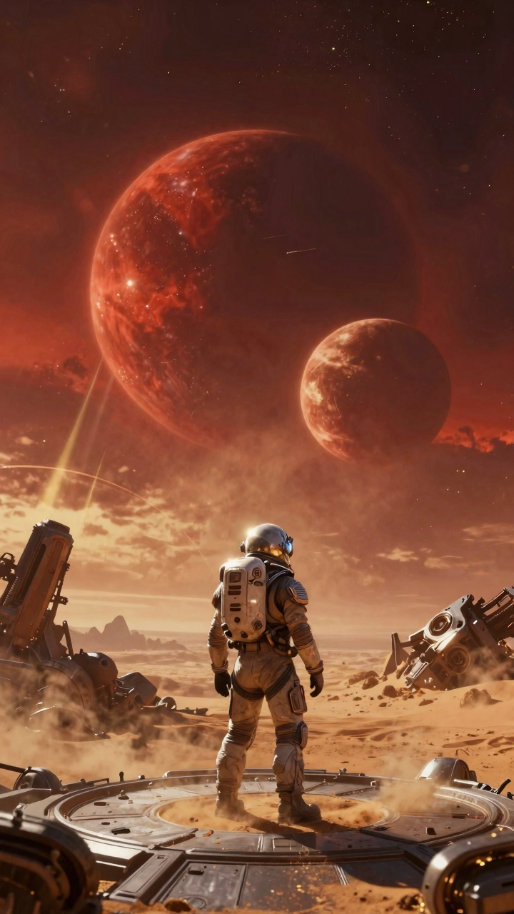 电影级光影概念图(扩写版) 提示词: “电影级科幻概念艺术,远景两颗不同大小的恒星正缓缓沉入异星赤红与橙金的复合地平线,天空布满尘埃云与散射光束;前景一名身穿重型宇航服的探索者立于金属探测平台,肩甲反射双阳光辉,脚下沙地因温差微微蒸腾热气;空气中漂浮着细密金色尘粒,被体积光勾勒出可视轨迹;背景散落着奇异晶岩与废弃的机械残骸,整体高动态范围呈现强烈冷暖对比与史诗孤独感,宛如《沙丘》与《星际穿越》融合的视觉震撼。” 测试点:复杂多光源模拟、大气透视与尘埃粒子、材质反射与细节刻画、情绪氛围与电影质感。 |