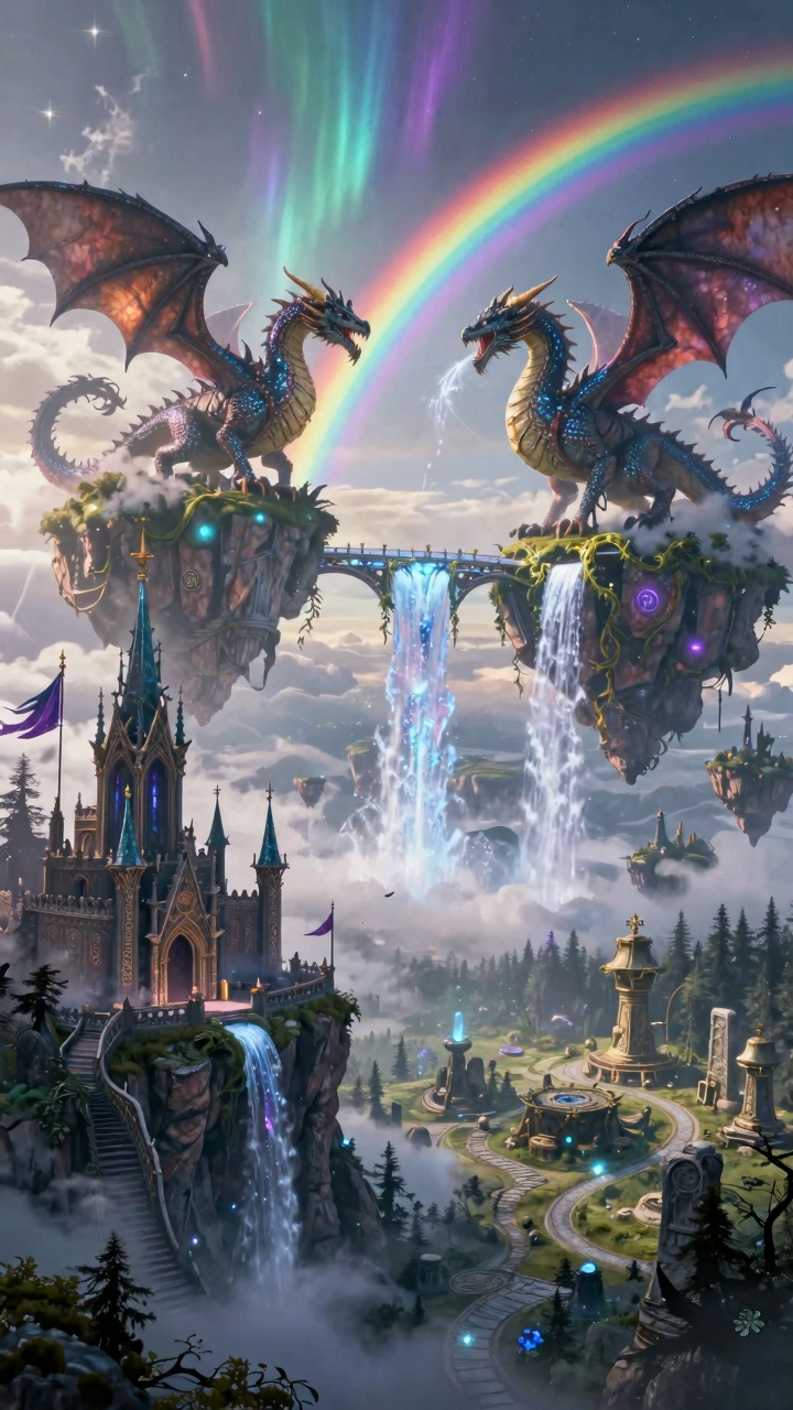 奇幻史诗场景(扩写版) 提示词: “宏大的奇幻史诗风景,天空被双轮彩虹与流动极光切割成瑰丽色块,数座浮空岛屿由水晶与藤蔓编织的发光桥相连,岛缘瀑布倾泻成银河般的光带坠入云海;近景悬崖上矗立着哥特式尖顶城堡,城墙镶嵌符文石,旗帜在魔法风中猎猎作响;天际三头巨龙盘旋,鳞甲反射晨曦,吐息化作蒸汽云雾;地面森林深处隐约可见精灵聚落与古代石阵,空气中弥漫微光粒子与悠远钟声回荡的氛围,呈现磅礴、神秘与生命交织的幻想世界。” 测试点:多层级场景搭建、生物与建筑细节、光影特效(极光、瀑布光带)、幻想元素的合理性、宏大构图的叙事感。 |